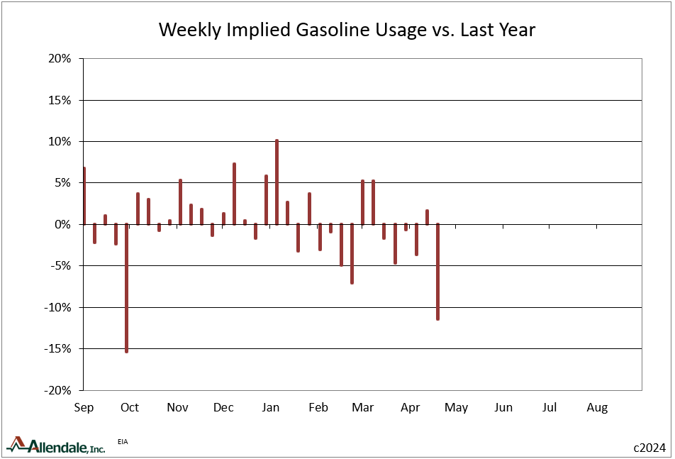 Gasoline demand this past week dipped to -11.4% from last year. Year to date implied usage is -0.3%.